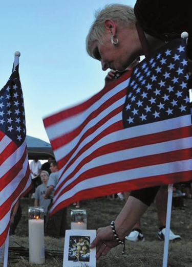 | 一名市民在枪击案发现场为遇难者安放一张纪念卡片 |