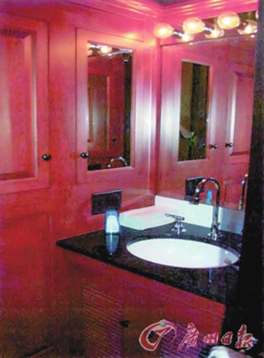 | 洗手间内墙面装嵌木板,水龙头价值689美元 |