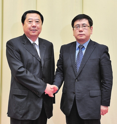 | 在2月2日下午的玉林市领导干部大会上,王凯同志与韩元利同志亲切握手(记者 蒋寿荣摄) |