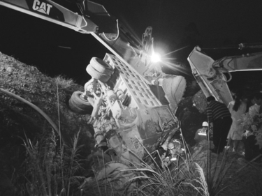 本报讯(记者李楷诚通讯员张钧军)20日,一辆满载泥土的泥头车驶至兴业县城隍镇塘肚村时,在一下坡路疑因刹车失灵导致车辆侧翻到约2米深的路基外,司机被困在变形的驾驶室内。兴业消防大队官兵在村民协助下,经过4小时的努力,终将被困驾驶员救出,所幸司机身体无大碍。 当晚7时12分,消防官兵到达事故现场。一辆装满泥土的泥头车侧翻于2米高的路基下,前挡风玻璃破碎,车头变形,驾驶员双脚被卡住无法动弹。现场医护人员已对受伤人员进行救治。事故发生后,工地方调集3辆勾机并组织现场人员第一时间营救,但尝试了多次仍无法将人救出来。 救援官兵确定初步救援方案,因救援空间太小,救援工作很难开展。 此时,现场群众找来“铁葫芦”机械装置。官兵于是用液压剪切钳将支撑车头的钢架切断,将“铁葫芦”一头固定在勾机上,通过现场群众的配合,将变形凹陷的车顶一点一点牵引。救援空间扩大后,再用液压扩张器、液压撑顶器将卡住驾驶员双脚的障碍物进行扩张、拆除。22时58分,驾驶员获救,经现场医护人员初步诊治,其双腿并无断裂等明显症状。 目前,事故原因交警部门正在进一步调查。