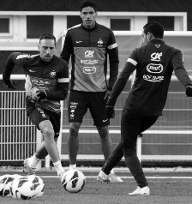 3月20日,法国队球员里贝里(左)、佩耶(右)和瓦拉内在训练中。