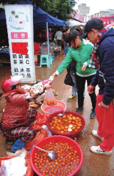 到灵山烟墩,吸引我的是那里的大鼓,并非美食。不过从那里回来,这个小镇留给我的深刻印象,除了大鼓,多了美食。 乍到烟墩圩镇的时候,空气中弥散着一种特殊气味让人捉摸不透,等走了一圈下来才恍然大悟,那气味是酸味。烟墩的圩日,不管走到哪个角落,你随处可找到酸料的影子。 每个城市圩镇都有酸料摊,你印象中的酸料摊应该大都是一个小摊,或者一辆老旧的三轮车做成的流动摊,招呼你的不是和蔼的老太太,就是麻利的妇女。这里的酸料摊却全然没有你想象中的那种小家碧玉样,而是一大盆摆在地上,然后多个小盆的摆在四周,摆摊的就坐在酸料中间,拿着刀给你切,拿天平秤给你称,很多都这样。而且摆摊的地方没有讲究,或者在人来人往的路边,或者就在四周摆卖青菜的繁闹市场。稍微做得“雅致”一点的,也不过搭个棚,但是那样的棚子往往也比较大,摆卖的酸料,一长溜的,很有气势。 烟墩的酸料五花八门,我们常见的萝卜、沙梨、木瓜这里自然少不了,像葡萄、牛甘果这样的水果也能做成酸料,却是让我们大开了眼界。初春的烟墩,竟然有新鲜的牛甘果摆卖街头,新鲜牛甘果做成的酸料,有点像玉林常见的水果酸料,但又是腌制泡成的,那味道很特别,口感不错。 如果说牛甘果酸料算不上特别的话,葡萄酸料想必你就难得一见吧。那葡萄,都是取自半熟的青提来腌制,因为半熟的缘故,基本上每一串都仍然保持得很完整,这让酸料的卖相多了一份可爱。腌制过的葡萄,颜色变成了浅浅的琥珀色,算不上透明,提起一串却感觉成了手里的一件工艺品,竟然有点不忍下口了。至于味道,你完全想象不出来:酸甜交织,酸是不刺鼻的酸,甜是清甜,依稀还能找到原味葡萄的味道。就连葡萄串前端米粒一般的小葡萄,也能吃出一番味道来,不能不赞叹烟墩人的创意。 同行的老虎是北京人,想必没见过这样的“酸料阵势”,兴致勃勃地蹲在一个卖沙梨酸料的摊子边上,称了两只,切开几片,几个人走在熙攘的人群里,边吃,边四处张望。 以为这样的吃相会引来回头无数,不想来往人群熟视无睹,小失落之下恍然大悟,在连空气都满散酸味的烟墩镇,吃酸料还能是什么新鲜事吗?